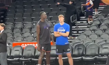 赛前,美国篮球媒体ClutchPoints更新社媒晒出库珀-弗拉格与卡曼-马卢阿奇赛前热聊的瞬间。